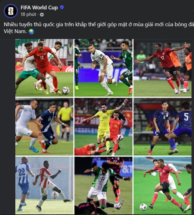 Cụ thể, FIFA đăng tải hình ảnh các tuyển thủ quốc gia trên thế giới sẽ thi đấu trong màu áo các đội bóng Việt Nam ở mùa giải tới, kèm theo dòng trạng thái: “Nhiều tuyển thủ quốc gia trên khắp thế giới góp mặt ở mùa giải mới của bóng đá Việt Nam.”
