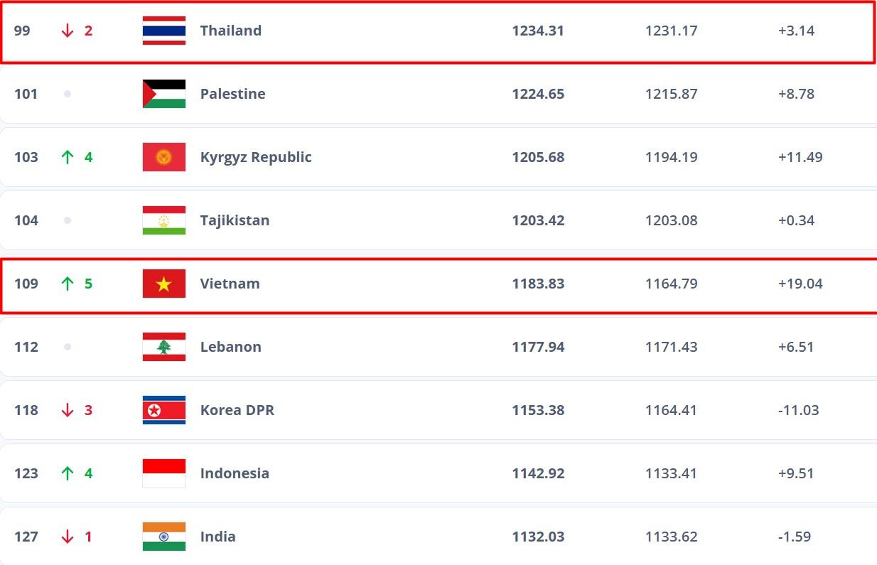 Việc tăng 5 bậc giúp Việt Nam rút ngắn khoảng cách với nhóm 100 đội tuyển hàng đầu thế giới và đồng thời thu hẹp khoảng cách với Thái Lan – đối thủ truyền kiếp trong khu vực Đông Nam Á. Hiện tại, “Voi chiến” xếp thứ 99 nhưng bị trừ điểm và rơi 2 bậc so với lần công bố gần nhất, trong khi khoảng cách với Việt Nam chỉ còn khoảng 50 điểm.