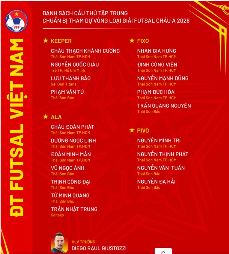 Ngày 15/8, HLV trưởng Diego Giustozzi đã chính thức công bố danh sách 20 cầu thủ được triệu tập vào đội tuyển futsal Việt Nam nhằm chuẩn bị cho Vòng loại futsal châu Á 2026. Lần tập trung này, lực lượng của đội tuyển hội tụ nhiều gương mặt giàu kinh nghiệm xen lẫn những tài năng trẻ triển vọng, hứa hẹn tạo nên sức cạnh tranh mạnh mẽ.